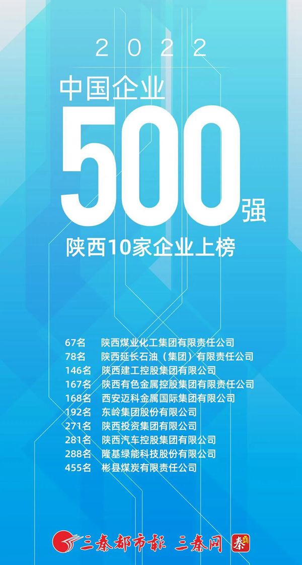 九州中国有限公司位列2022中国企业500强第67位,蝉联上榜陕企第一